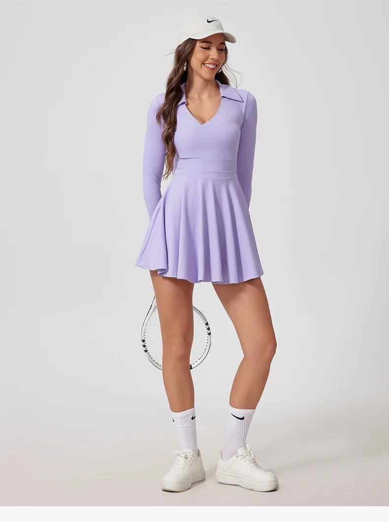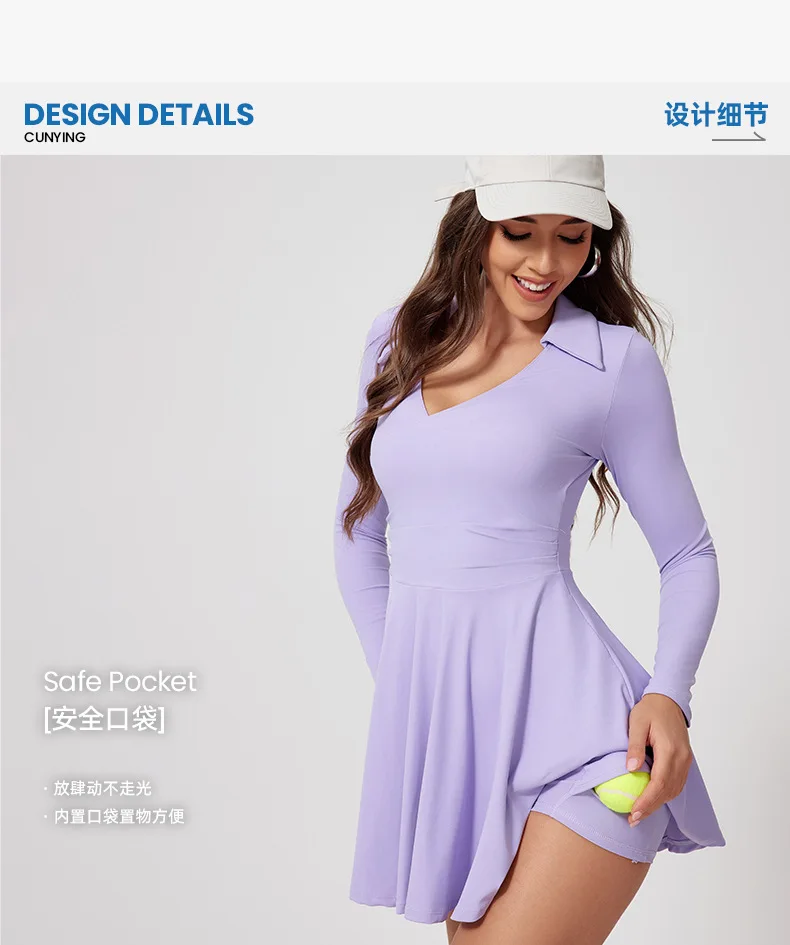 Women Tennis Dress with Shorts Long Sleeve Sports Skirt No Pad Workout Suit V Neck Badminton Fitness Clothing